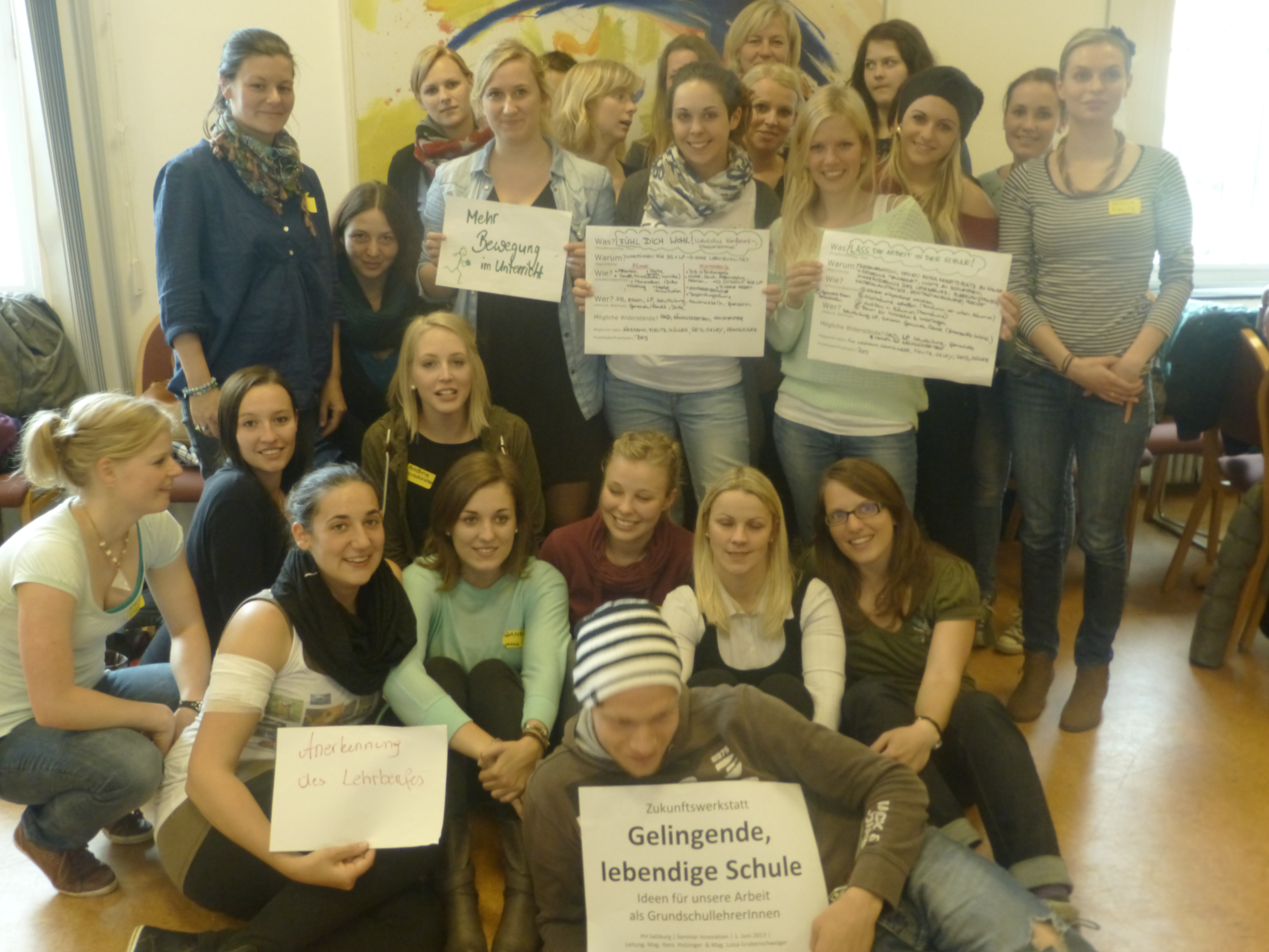 Im Rahmen ihres Seminars „Innovation“ an der Pädagogischen Hochschule Salzburg boten Hans Holzinger und Luisa Grabenschweiger eine Zukunftswerkstatt an, an der insgesamt 25 Studierende teilgenommen haben. Die Veranstaltung hatte zwei Ziele: Zum einen sollten die Studierenden die Methode „Zukunftswerkstatt“ kennen lernen und einüben. Zum anderen sollten Ideen für eine gelingende, lebendige Schule entwickelt werden, die in die eigene Arbeit als LehrerIn einfließen sollten. Die Studierenden sollten Anregungen erhalten, die sie als junge LehrerInnen als Innovationswissen in ihre zukünftige Schule einbringen. Selbstverständlich ging es auch darum, Schule wie wir sie derzeit erleben kritisch zu reflektieren.