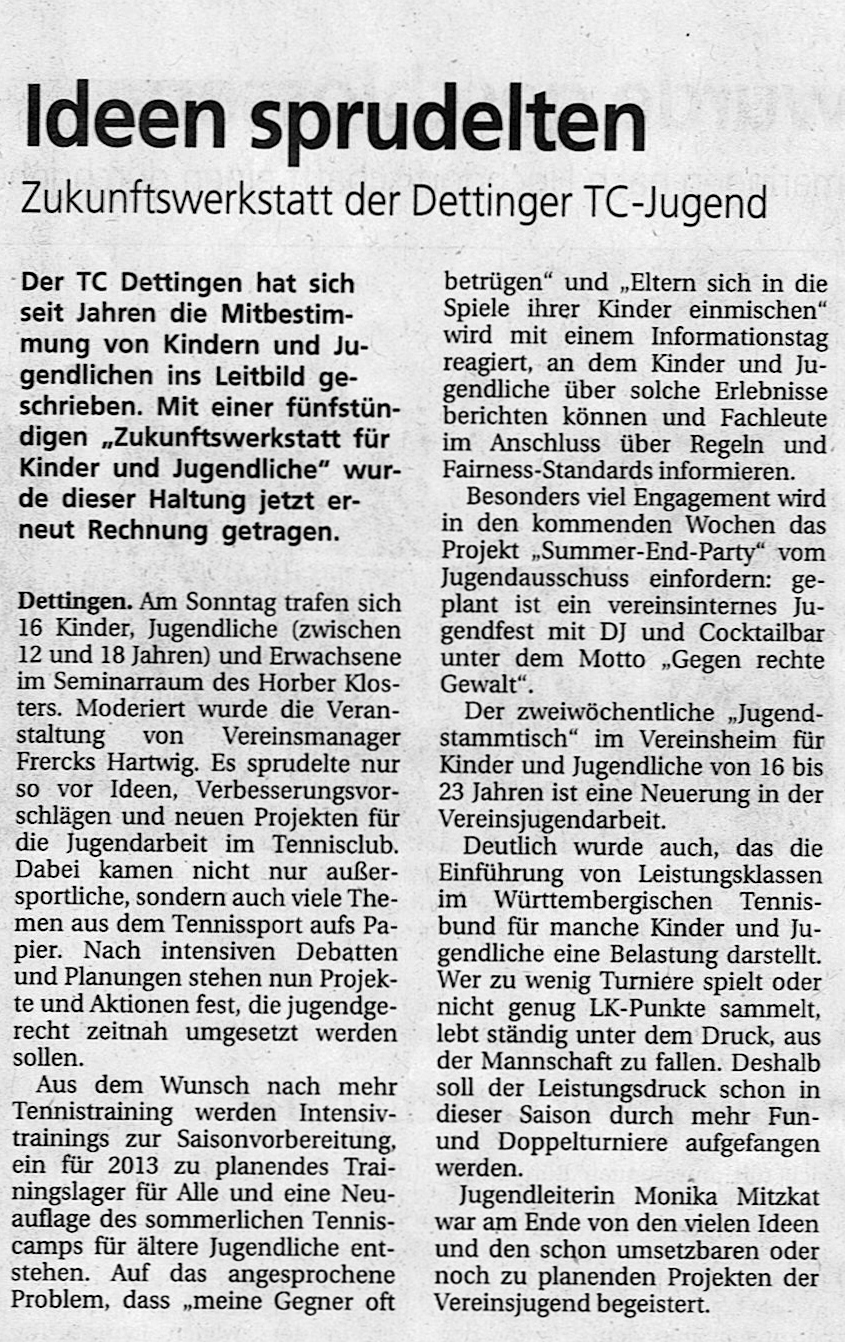 Frercks Hartwig ist Manager und Jugendpädagoge des Tennisclubs Dettingen. Er war Teilnehmer der JBZ-Ausbildung „Zukunftswerkstätten gekonnt anleiten“ und hat uns folgenden Bericht einer Zukunftswerkstatt gesandt, die er im Frühling 2012 mit Jugendlichen des Tennisclus durchführen konnte. Dabei entstanden viele spannende Projekte. Der Verein TC Dettingen (liget zwischen Tübingen und Freiburg) wurde bereits mehrfach für seine Mitbestimmungspraxis im Jugendbereich ausgezeichnet (www.tcdettingen.de).