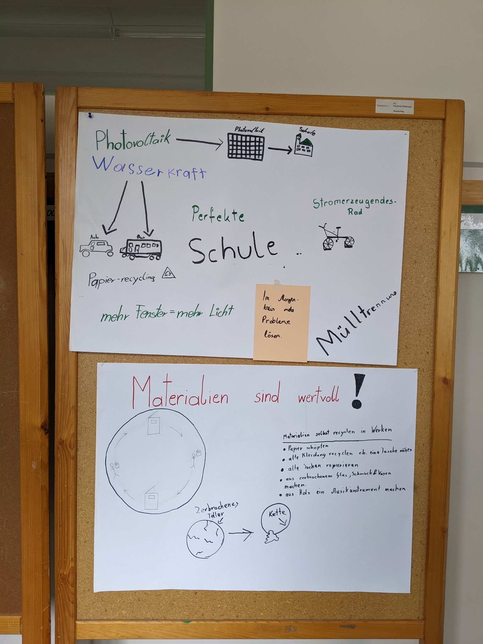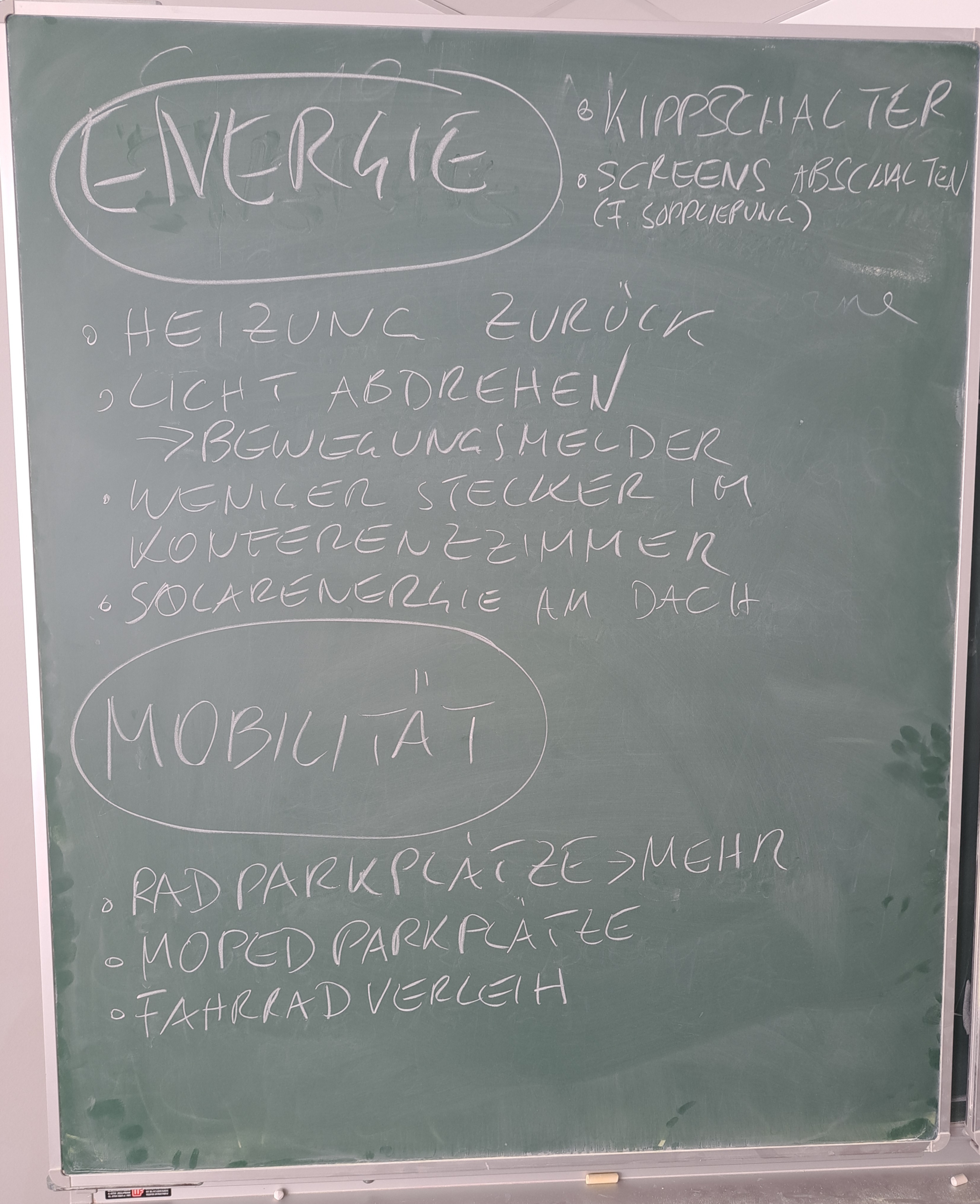 Praktische Maßnahmen zum Energie- und Ressourcensparen werden ebenso entwickelt wie Vorschläge im Mobilitäts- und Energiebereich. Mehr Fahrradabstellplätze, bessere ÖV-Verbindungen, Strom- und Papiersparen, Möglichkeiten zum Kochen in der Schule, der Aufbau eines Schulgartens sowie mehr vegetarische und vegane Angebote beim Schulbuffet lauten einige der entwickelten Ideen. Die Zukunftswerkstätten werden moderiert von Carmen Bayer und Hans Holzinger von der Robert-Jungk-Bibliothek mit Unterstützung von Workshop-Leiter:innen von Südwind. Gefördert wird das Projekt aus Mitteln des Landes Salzburg.