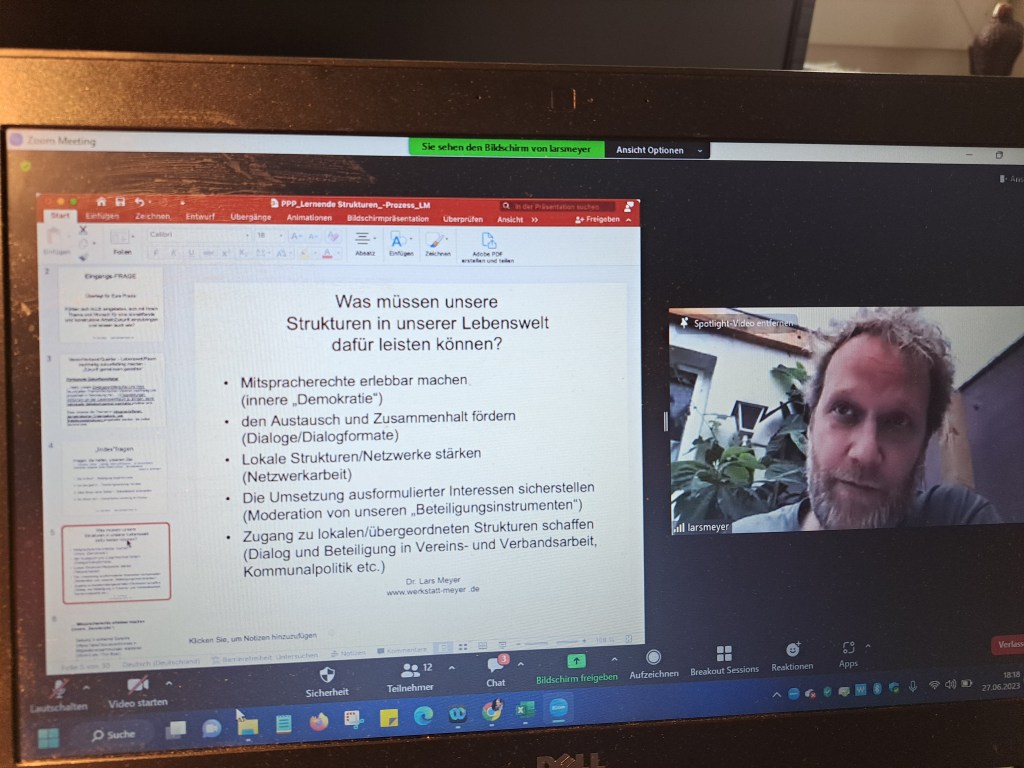 „Fühlen sich alle eingeladen, sich mir ihrem Thema bzw. Wunsch für eine sinnstiftende und konstruktive Zukunft einzubringen und wissen auch wie?“ – dies sei eine zentrale Frage für gelingende Beteiligungsprozesse, betonte Lars Meyer in seinem Input im aktuellen Webinar des Netzwerk Zukunftswerkstätten, das am 27. Juni 2023 stattfand. Am Beispiel von Projekten aus Krefeld schilderte er, wie ein „lernender Stadtteil“ entstehen und sich weiterentwickeln könne. Mitsprache müsse erlebbar gemacht, individuelle Selbstwirksamkeit gefördert werden, dabei sei es auch wichtig, den Personen Verantwortung für ihre Ideen und Vorhaben zu übertragen.