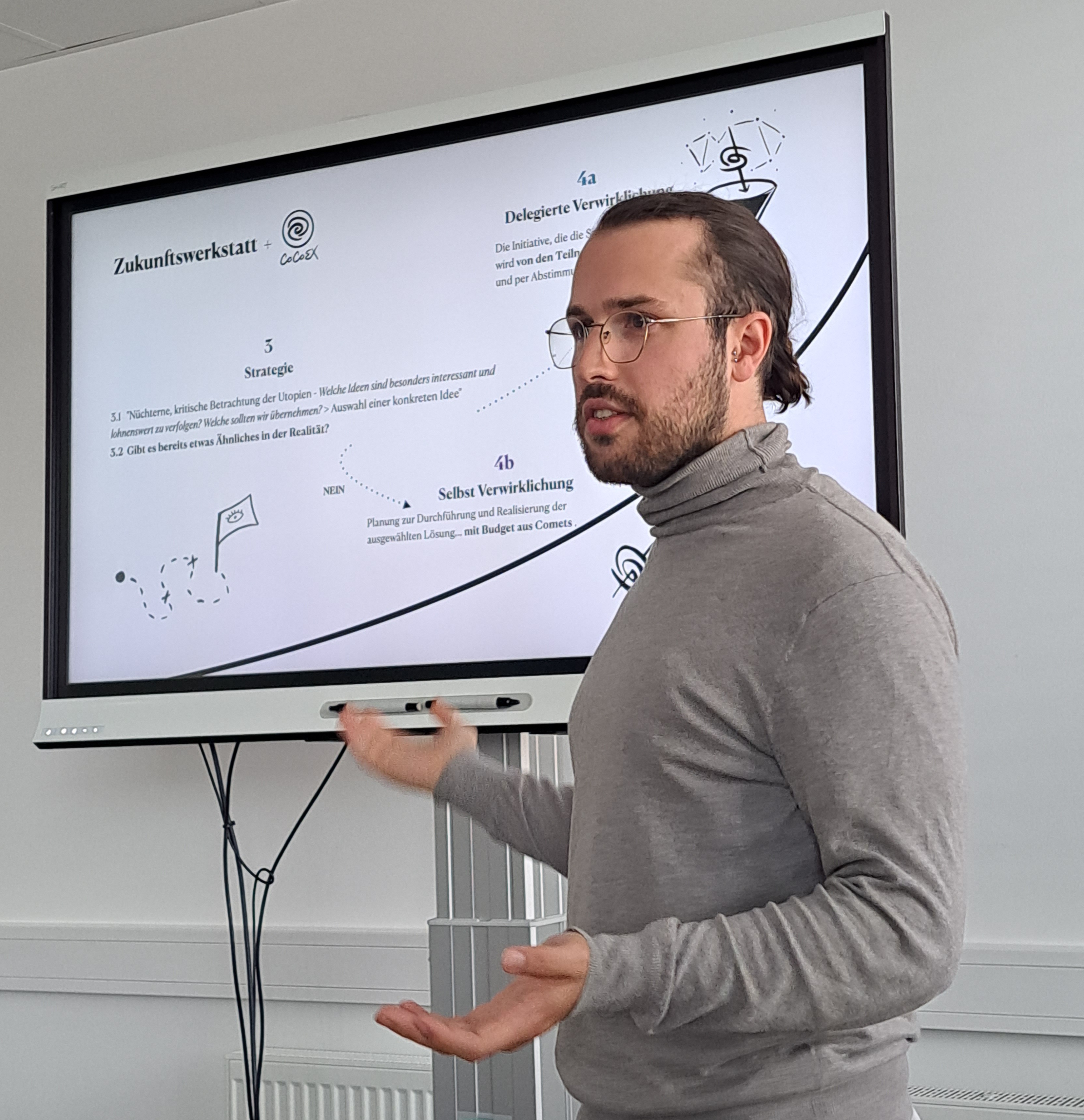 Nach einem gemeinsamen Mittagessen stellte Matteo Bruni das Projekt „cocoex“ vor. cocoex entsteht aus “compounds coexists”, also „Verbindungen coexistieren“. Technologie wird als Rahmen genutzt, um Gemeinschaften mithilfe bereits bestehender sozialer Innovationen wie der Zukunftswerkstatt zu ermächtigen und durch Kunst, Wirkung und Transformation voranzutreiben. Durch die Auktion von digitaler Kunst sollen lokale Zukunftswerkstätten finanziert werden, deren Ideen in eine soziale Plattform eingespeist werden. Mittels Blockchain-Technologie sollen allen Mitgliedern der Plattform zur Weiterentwicklung der Ideen beitragen können. Die Zukunftswerkstätten laufen nach dem Dreischritt Kritik – Utopie – Strategie & Verwirklichung ab. Neu am Konzept ist jedoch, dass die Verwirklichung einer Idee nicht nur von der Gruppe umgesetzt werden muss, die sie entwickelt hat, sondern dass diese an eine andere Gruppe abgegeben werden kann („Delegierte Verwirklichung“). Die Initiative, die die Spende erhalten wird, wird von den Teilnehmern identifiziert und per Abstimmung ausgewählt. Das Projektteam um Matteo sucht nun Menschen, die erste Pionier-Zukunftswerkstätten moderieren wollen. Ihr könnt gerne mit Matteo Bruni Kontakt aufnehmen.