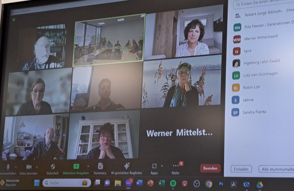 Teilgenommen haben: Maren Schüppenhaus und Fritz Letsch aus München, Matteo Bruni und Fabian Hagen aus Berlin, Lars Meyer aus Krefeld, Peter Mlzoch, Wien aus Edith Frauscher und Sebastian Riedel aus Salzburg sowie Carmen Bayer und Hans Holzinger von der Robert-Jungk-Bibliothek Salzburg. Im Online-Teil kamen dazu: Lutz von Grünhagen, Ingeborg Latzl-Ewald, Robin Loh, Rita Nassen , Werner Mittelstaedt, Helmut Peters, Sandra Pienta, Sabine Treike,