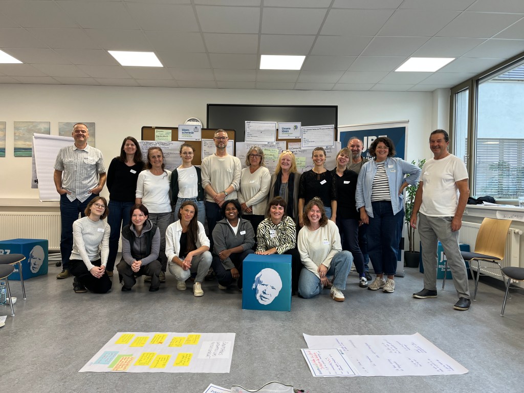 Fünfzehn weitere Teilnehmende aus Deutschland und Österreich haben soeben die Ausbildung „Zukunftswerkstätten gekonnt anleiten“ der Robert-Jungk-Bibliothek für Zukunftsfragen (JBZ) erfolgreich abgeschlossen. Einer theoretischen Einführung am ersten Tag folgte eine vom Ausbildungsteam moderierte Übungswerkstatt, in der die Methode praktisch erfahrbar gemacht wurde. Am dritten Tag erstellten die Teilnehmenden in zwei Gruppen Drehbücher für eigene Kurzwerkstätten, die am vierten Tag durchgeführt und reflektiert wurden. Die Themen stammten jeweils aus der Gruppe. Das Ausbildungsteam bestehend aus Carmen Bayer und Hans Holzinger (JBZ) sowie Sarah Untner (raumsinn) freut sich über „Nachwuchs“ und wünscht gutes Gelingen für die ersten Werkstätten in „Realsituation“. Nach Durchführung der ersten Zukunftswerkstatt in ihrem Berufsumfeld können die Teilnehmenden in die Moderierendendatenbank aufgenommen werden. Die nächste Ausbildung findet im Februar 2026 statt. Fotos: JBZ