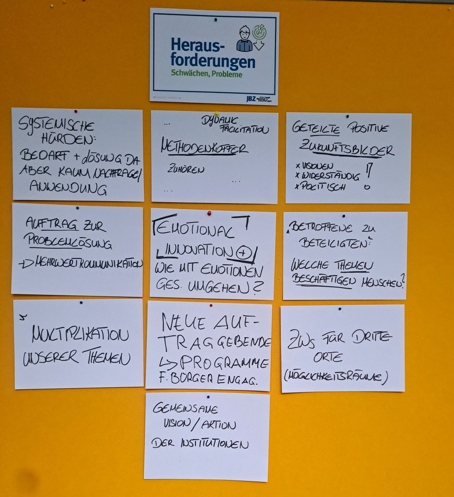 Im Rahmen einer Vorstellrunde wurden Herausforderungen gesammelt, die beim Treffen besprochen werden sollten. Ein zentrales Thema war die schwieriger gewordene Vermittlung unseres Wissens und methodischen Könnens in Zeiten wirtschaftlicher und gesellschaftlicher Umbrüche. Die Auftragsaquise sei schwieriger geworden, obwohl es großen Bedarf an Zukunftsorientierung gäbe, so ein Tenor. Es müsse der Mehrwert von Zukunftswerkstätten vermittelt werden, zugleich wurde betont, dass potentielle Auftraggebende keine bestimmte Methode anfragen, sondern ein Anliegen haben. Dieses im Auftragsgespräch mit den OrganisatorInnen zu schärfen, ihnen behilflich zu sein, ihre Fragestellung zu finden, sei ein wichtiger Aspekt, berichtete etwa Edith Frauscher von Hummelhirn aus ihren Erfahrungen („Die möchten das Loch in der Wand, nicht die Bohrmaschine“).