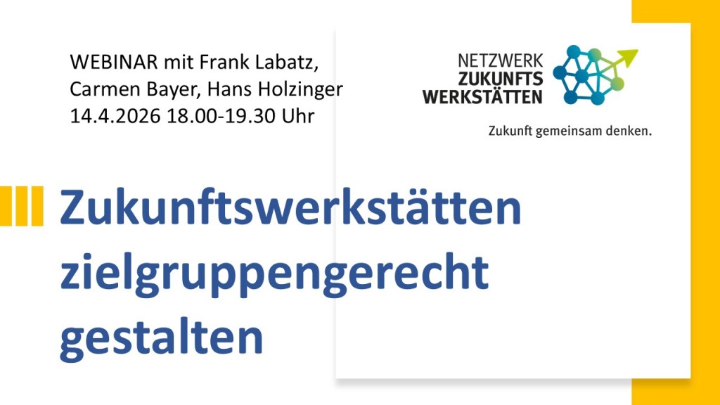 Wie spreche ich potentielle Teilnehmende in der Einladung an? Mit welchen Methoden werden die jeweiligen Phasen einer Zukunftswerkstatt gestaltet? Zielgruppenabhängig variieren auch Moderation und Sprache sowie die Gestaltung des Ablaufs. In diesem praxisorientierten Webinar beschreiben Frank Labatz, Hans Holzinger und Carmen Bayer bereits durchgeführte Zukunftswerkstätten für Jugendliche, unterschiedliche Trägerorganisationen sowie Kommunen.